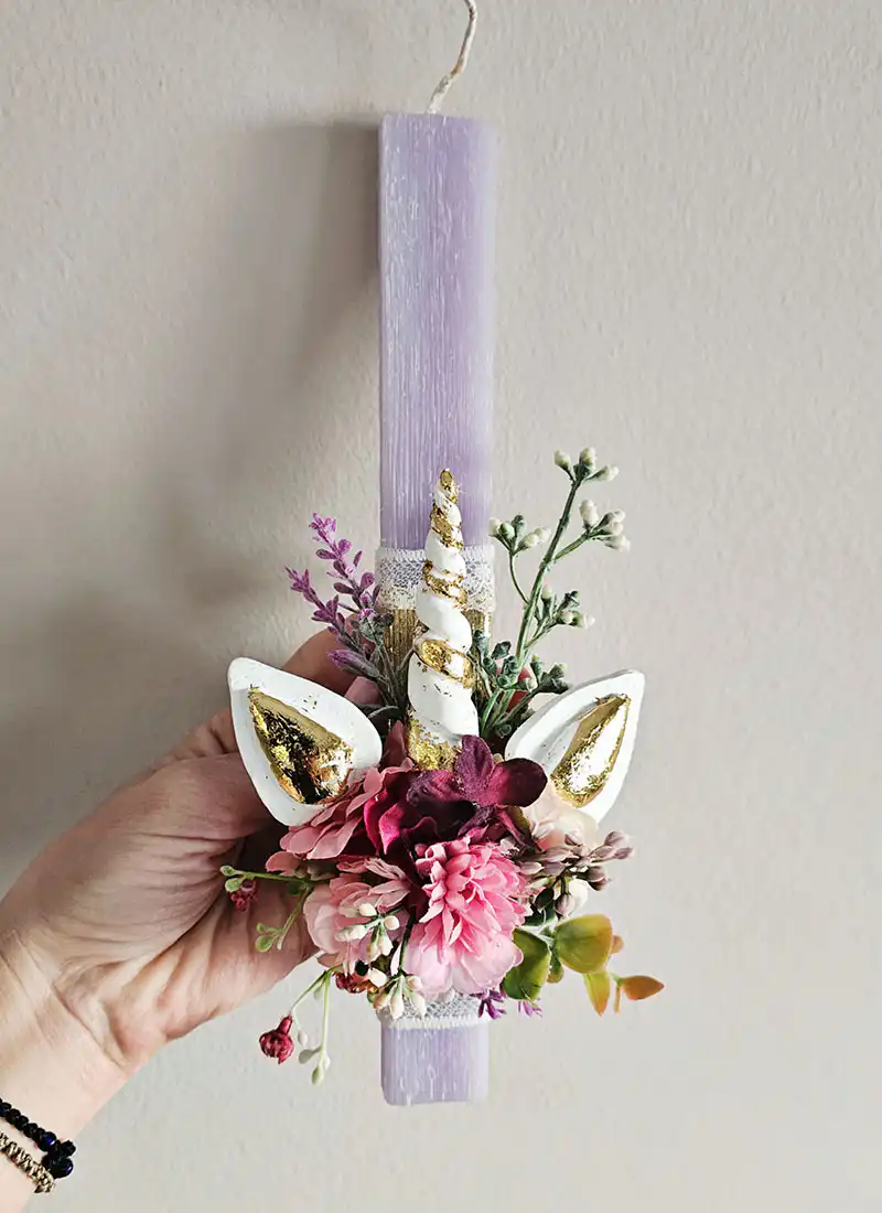 Μια ιδιαίτερη πασχαλινή λαμπάδα διακοσμημένη με σύνθεση εμπνευσμένη από τον μαγικό κόσμο του μονόκερου.